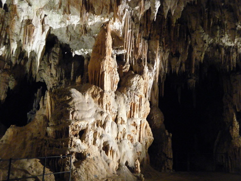 El castillo, metido dentro de una cavidad a 120 m de altura es una pasada. Construido en 1570, tuvo que ser restaurado en 1990 fortaleciendo los cimientos. Justo a sus pies hay una pista de “torneos de caballeros”, y es que con este escenario uno se imagina ya a los caballeros con las lanzas, recreación que se hace alguna vez. El castillo tiene tres plantas y una hora larga se puede echar paseando por sus salas. De ahí fuimos a las cuevas, que son de origen kárstico y miden al menos 20 km, de las más grandes de Europa. Dentro la temperatura es de 8º C, importante tenerlo en cuenta. Uno se hace una idea de su magnitud cuando coge el tren que lleva a la sala principal y recorre túneles durante cinco minutos.