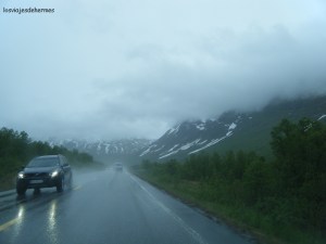 Nos separaban unos 660 kms por carreteras en bastante buen estado hasta Cabo Norte de ida y otros tantos de vuelta al día siguiente, una locura sin duda, pero sarna con gusto no pica. Se pueden ahorrar unos 120 kms cogiendo dos ferrys en la zona de Lyngen, como hicimos a la vuelta. Tras un breve paseo por Tromsø partimos por la ctra. E-8 a Nordkjosbotn, donde enlazamos con la E-6 a Oteren y Alta, el paisaje, pese a que llovía, era impresionante con la carretera rodeando los fiordos como el de Lyngen, vegetación muy frondosa y cascadas de agua por todas partes, así que nos lo tomamos con calma. Pasamos otras poblaciones como Olderdalen (donde llega/sale el ferry de/a Lyngseidet, del que hablaremos después) y Alta, que está a mitad de camino a Cabo Norte, donde paramos a comprar en un supermercado y comimos. 10 kilómetros antes de llegar a Alta vimos un letrero que indicaba el museo del Tirpitz (buque alemán de la II Guerra Mundial y que dejamos para la vuelta). Importante saber que las compañías SAS y Norwegian vuelan desde Oslo hasta el aeropuerto de Alta por lo que a la hora de visitar Cabo Norte puede ser rentable, nosotros elegimos Tromsø por el precio que nos salía mejor con diferencia