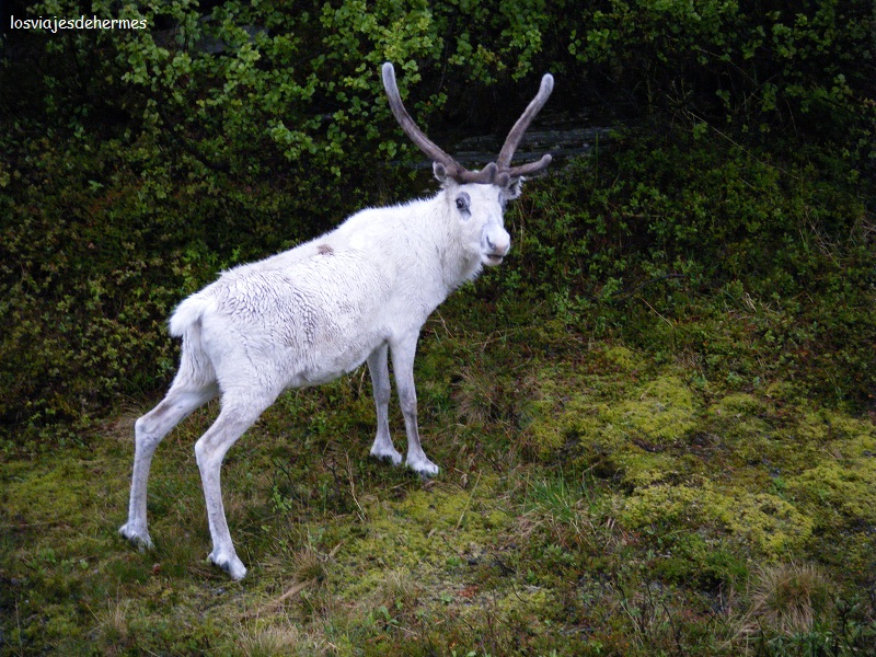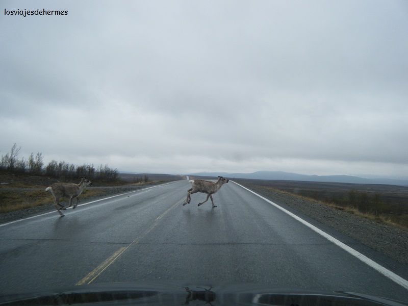 Continuamos por la E-6 (de Alta a Cabo Norte hay 250 kms) hacia Skaidi y Russenes, donde se coge el desvío para la E-69 dirección Repvåg y Cabo Norte (Nordkapp). Progresivamente mientras se avanza al norte la vegetación va reduciéndose hasta quedar en un manto verde y hierbas bajas, y se empiezan a ver muchos renos, a nosotros un grupo entero se nos cruzó por la carretera, y más de una vez paramos y nos acercamos un poco a verlos.