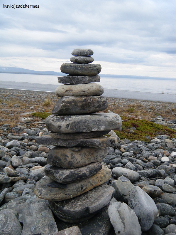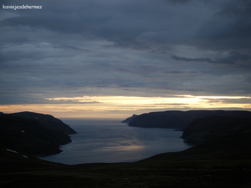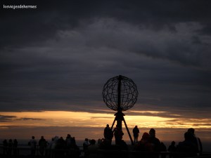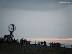 Cabo Norte está considerado como el punto más septentrional de Europa, aunque en realidad es el cabo paralelo de Knivskjellodden, y está por encima de los 71º Norte de latitud. Para acceder pagamos 195 NOK=26 € cada uno, no sé que cara debí poner que la chica del acceso nos recordó si teníamos carnet de estudiante o algo para hacernos descuento y todo (así que comentarlo si lo tenéis). Lo cierto es que ya estábamos allí, arriba del todo, ya sólo al final del acantilado el agua del océano Glacial Ártico. Comimos algo de nuestras provisiones en el parking y a ver el centro de visitantes, donde hay una tienda de souvenirs, un restaurante y una sala de exposiciones y vídeo, y ya a disfrutar de las vistas desde el monumento de la esfera terrestre con paralelos y meridianos el día más largo del año, donde el sol no se llega a poner, desciende hasta casi el horizonte para subir de nuevo, es el fenómeno conocido como “sol de medianoche” y característico de estas latitudes en verano (en invierno es noche y dominan las auroras boreales). Desgraciadamente el cielo cubierto nos impidió ver el fenómeno, e incluso llovió después, pero igualmente se notaba que era “de día”, así que paseamos también por los monumentos de “los niños del mundo”, una especie de monedas y comenzamos la vuelta a la una más o menos.