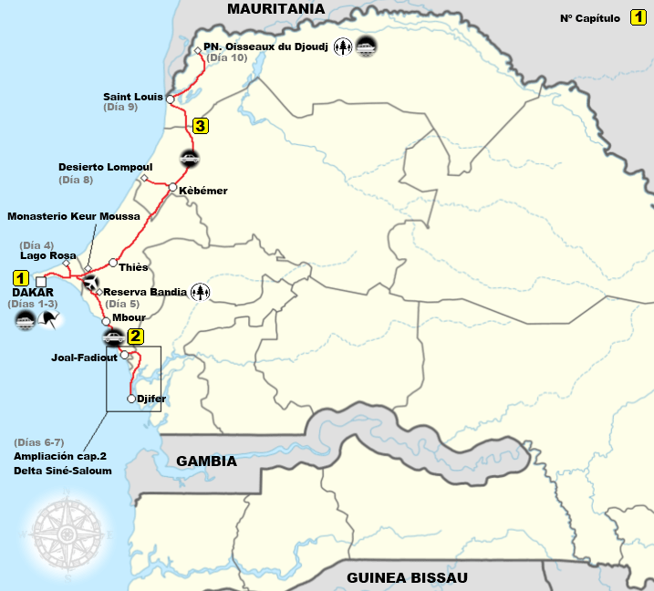 Itinerario: juntaré las excursiones que pudimos hacer, todas ellas por la costa (el que vaya a conducir necesitará el carné internacional que expide Tráfico en España), añadiendo unos tres días para Dakar (donde resumo lo que a mi juicio puede ser lo mejor), lo que dan un total de 10 días sin contar los vuelos (ver mapa).