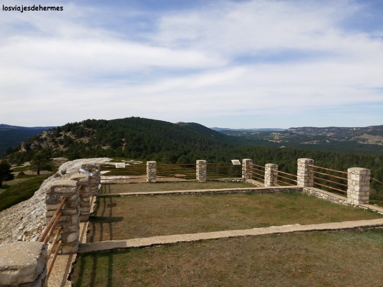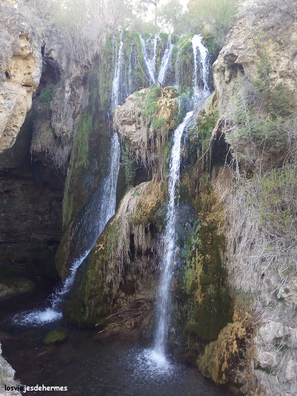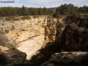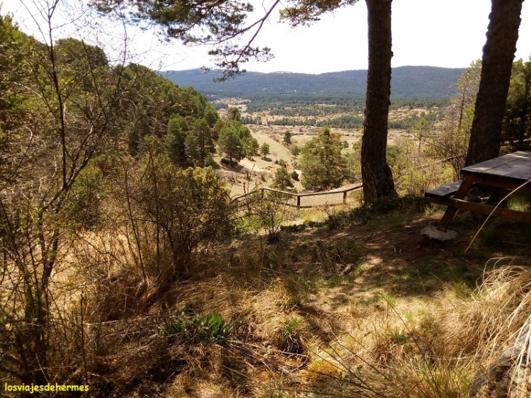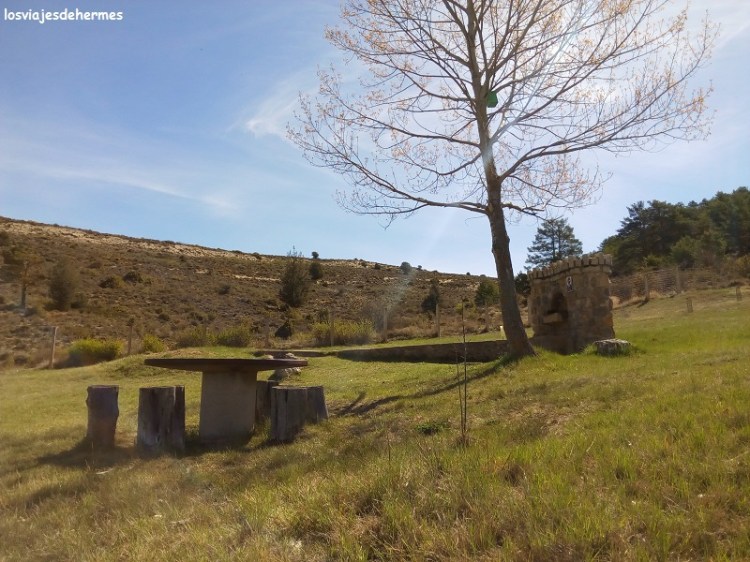La marcha nos llevó por senderos despejados hasta que entramos en los pinares de una colina cercana, dando con el nacimiento del río casi por intuición y porque otra pareja lo andaba buscando, el lugar está delimitado con unas vallas de madera y si no fuera por ello sería difícil de encontrar. Apenas se observa una pequeña salida de agua de entre las rocas, pero resulta un lugar agradable, donde pudimos descansar y contemplar el paisaje sentados en una de las mesas de madera que hay. Este itinerario nos llevaría una hora aproximadamente, parando después a comer en el único bar que encontramos en el pueblo, sin verle nombre alguno, un menú por 11,50 € cada uno con el que acabamos satisfechos.