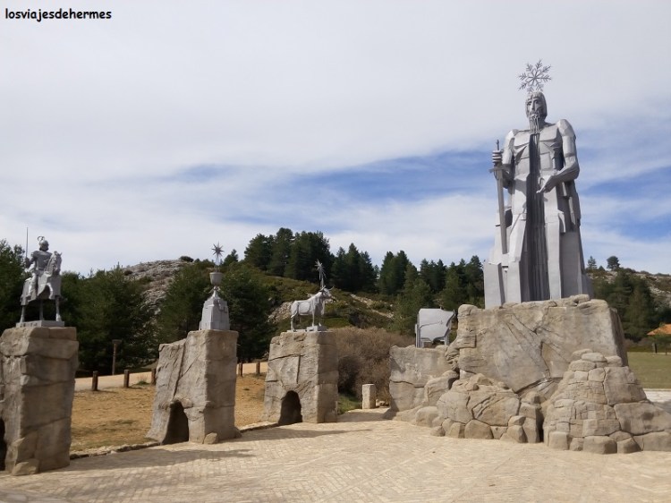Continuamos la ruta subiendo al puerto del Portillo, que con sus 1.790 metros de altitud domina la zona y el paisaje, ofreciendo desde su mirador una panorámica despejada y sin apenas rastros de civilización salvo la propia carretera y alguna que otra torre de observación y vigilancia forestal, un lugar que nos gustó particularmente a los dos, la verdad. Bajando del mismo se llega al límite entre Aragón y Castilla-La Mancha que marca el río Tajo, cuyo nacimiento queda a varios kilómetros de distancia por la ctra. A-1704 (en total hay unos 16 desde Guadalaviar). El nacimiento del río Tajo era el punto fuerte de la excursión, si bien uno adivina la grandeza e importancia del lugar por las esculturas y monumentos que presiden el paraje, pues viendo el pequeño caudal de agua que surge de esta parte de la sierra de Albarracín sería complicado imaginar que es el más largo de la península ibérica 😀 .