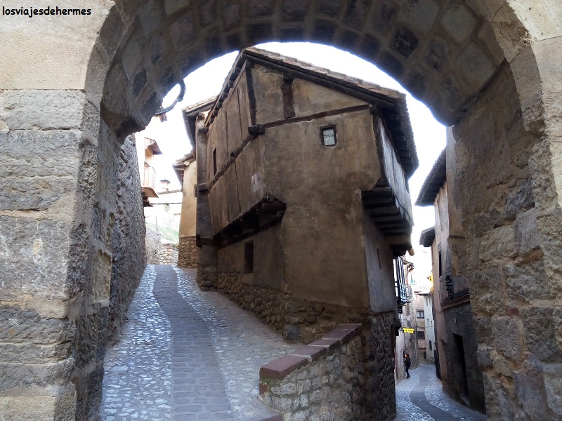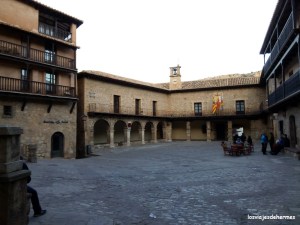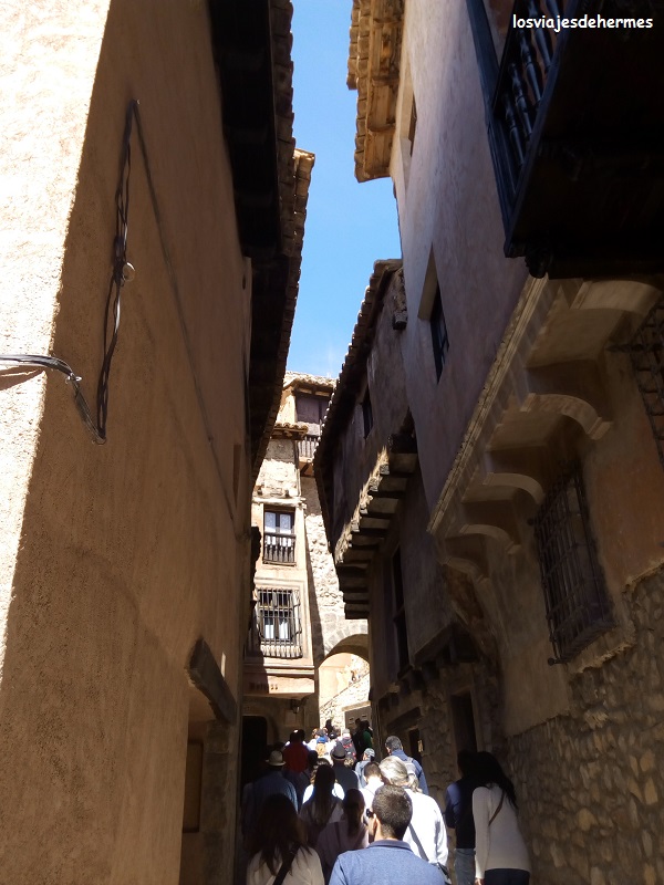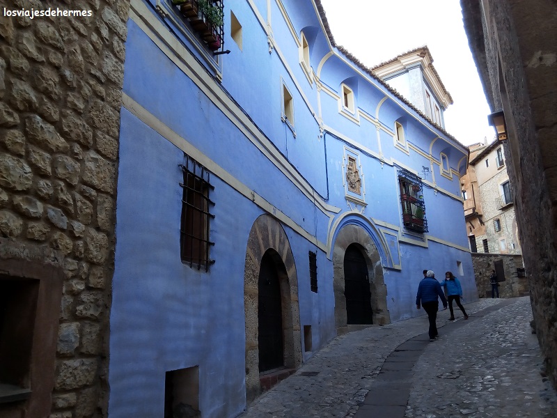 Para ello nos presentamos en su centro de información junto al Palacio Episcopal y la Catedral, visionando un vídeo introductorio de la historia y acontecimientos principales de Albarracín, que era un buen punto de partida para ir entendiendo las animadas charlas de nuestro guía. Con un grupo cuantioso, pero no agobiante, recorrimos los principales puntos de la ciudad durante hora y media aproximadamente, con numerosas explicaciones del uso de los edificios durante las épocas sucesivas, la arquitectura local, los personajes que dieron forma a su historia…realmente interesante, a lo que ayudó en gran medida el énfasis y entusiasmo de nuestro guía. Y de esta guisa fuimos pasando y observando puntos de interés como el Portal del Agua (una de las varias que cruza la muralla), la plaza Mayor, la Iglesia de Santiago, la casa de la Comunidad, la de la familia noble de los Navarro de Arzuriaga -que rompe con su llamativo tono azul el conjunto arquitectónico-, o construcciones imposibles para aprovechar al máximo el espacio, como la conocida casa de la Julianeta, en el Portal de Molina, y callejuelas estrechas donde los balcones y los cuerpos de las casas se amplían y casi se tocan, como la del Postigo.