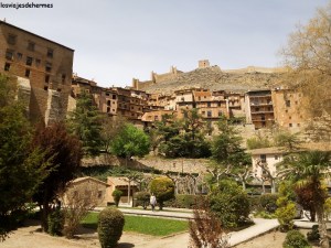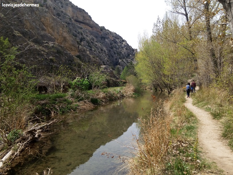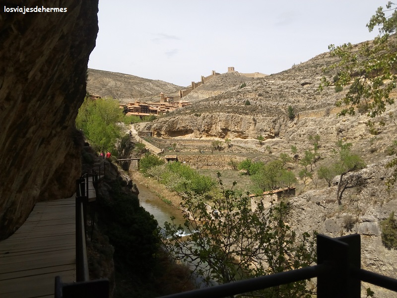 Previo descanso a la sombra del parque municipal contiguo al parking nos pusimos en marcha, atravesando por un puente al lado opuesto y siguiendo la vereda hasta cruzar por otra pasarela que ofrece una preciosa foto, con las aguas transparentes del río por un lado y las rocas que sustentan a Albarracín por otro. El paseo continúa por una plataforma elevada junto a las mencionadas rocas, todo muy pintoresco y agradable, bajando las escaleras que ya sí pone a la vereda al nivel del río, volviendo a entrar en la población por el Portal del Agua. En total es algo más de un kilómetro de distancia que se hace cómodamente, generalmente a la sombra y que ambos creemos que merece la pena 😀 .