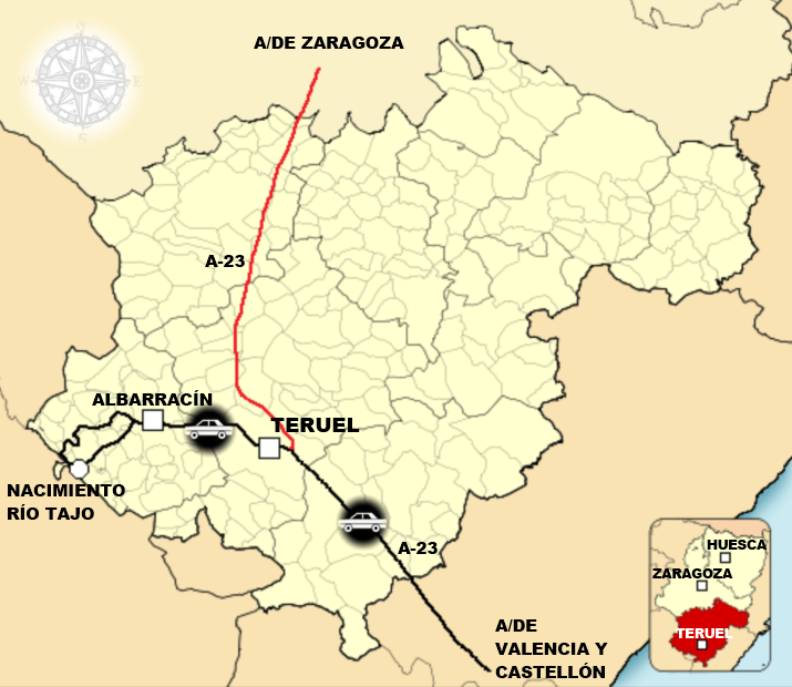 Salimos de Castellón por la tarde hacia el sur por la CV-10 hasta enlazar con la autovía Mudéjar (A-23), que desde Sagunto se adentra en Aragón, desviándonos en Teruel por la N-234 primero y finalmente la carretera comarcal A-1512, que tras pasar por el pueblo de Gea de Albarracín llega a la capital de la comarca y el que era nuestro destino, Albarracín, recorriendo en total los 190 kms ya mencionados en lo que definiría como un trayecto cómodo y atractivo, con mucha variedad paisajística.