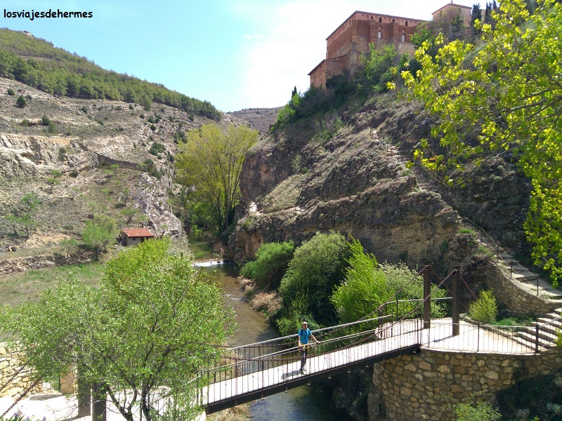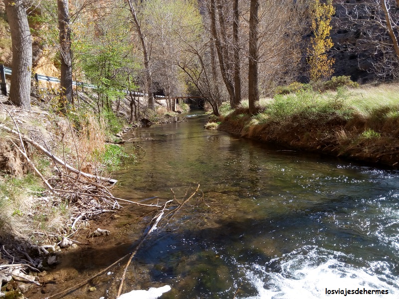Previo descanso a la sombra del parque municipal contiguo al parking nos pusimos en marcha, atravesando por un puente al lado opuesto y siguiendo la vereda hasta cruzar por otra pasarela que ofrece una preciosa foto, con las aguas transparentes del río por un lado y las rocas que sustentan a Albarracín por otro. El paseo continúa por una plataforma elevada junto a las mencionadas rocas, todo muy pintoresco y agradable, bajando las escaleras que ya sí pone a la vereda al nivel del río, volviendo a entrar en la población por el Portal del Agua. En total es algo más de un kilómetro de distancia que se hace cómodamente, generalmente a la sombra y que ambos creemos que merece la pena 😀 .