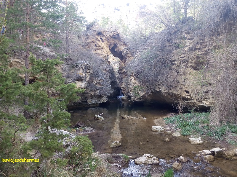 La marcha nos llevó por senderos despejados hasta que entramos en los pinares de una colina cercana, dando con el nacimiento del río casi por intuición y porque otra pareja lo andaba buscando, el lugar está delimitado con unas vallas de madera y si no fuera por ello sería difícil de encontrar. Apenas se observa una pequeña salida de agua de entre las rocas, pero resulta un lugar agradable, donde pudimos descansar y contemplar el paisaje sentados en una de las mesas de madera que hay. Este itinerario nos llevaría una hora aproximadamente, parando después a comer en el único bar que encontramos en el pueblo, sin verle nombre alguno, un menú por 11,50 € cada uno con el que acabamos satisfechos.