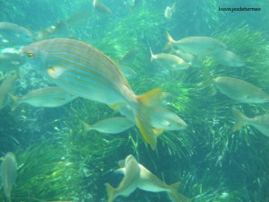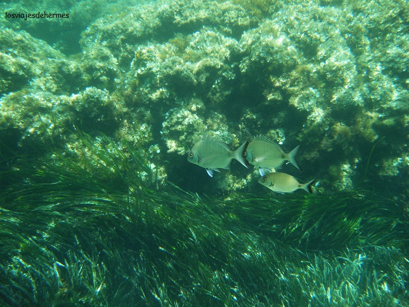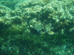 En un momento nos informaron de todo, y al cabo de un rato estábamos abajo ya con las cosas de buceo y zapatillas de agua, pues hay mucha roca. La isla destaca especialmente por los fondos marinos, de ahí que sea reserva marina, y hacer snorkel debería ser parte esencial de ser posible, pudiendo disfrutar igualmente del encanto de esta pequeña población y su tranquilidad una vez que las hordas de turistas han regresado a sus puertos de origen. Empezamos buceando por la zona de la punta este y al sur, repitiendo años anteriores. En toda la isla lo que más se ve son las praderas de posidonia, un alga característica del mediterráneo, bancos de salpas a los que te puedes acercar bastante, pues no se puede pescar, otras especies de peces, y también se pueden ver pulpos, estrellas de mar y aunque son mucho más escurridizos, y yo nunca he podido verlos, hay caballitos de mar. Ya cuando nos cansamos fuimos a comer, y es que la oferta en verano es amplia y ya al bajar del barco os darán publicidad de varios sitios.