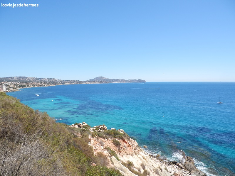 Miriam se animó a bañarse, pero yo encontré el agua un poco fresca. Desayunamos allí y nos fuimos a dar un paseo a Moraira, una pequeña población costera que pertenece al municipio de Teulada y posee unas aguas totalmente transparentes que no tienen nada que envidiar a otras partes del mundo más famosas. Yo ya había estado por la zona y sabía que la carretera de Moraira a Calpe es pintoresca y merece la pena ir despacio, entre curvas, calas y vistas del peñón de Ifach, decidimos no parar hasta la vuelta y llegar lo más próximos posible del parque natural del peñón, es decir a un parking de tierra cercano al centro de visitantes.