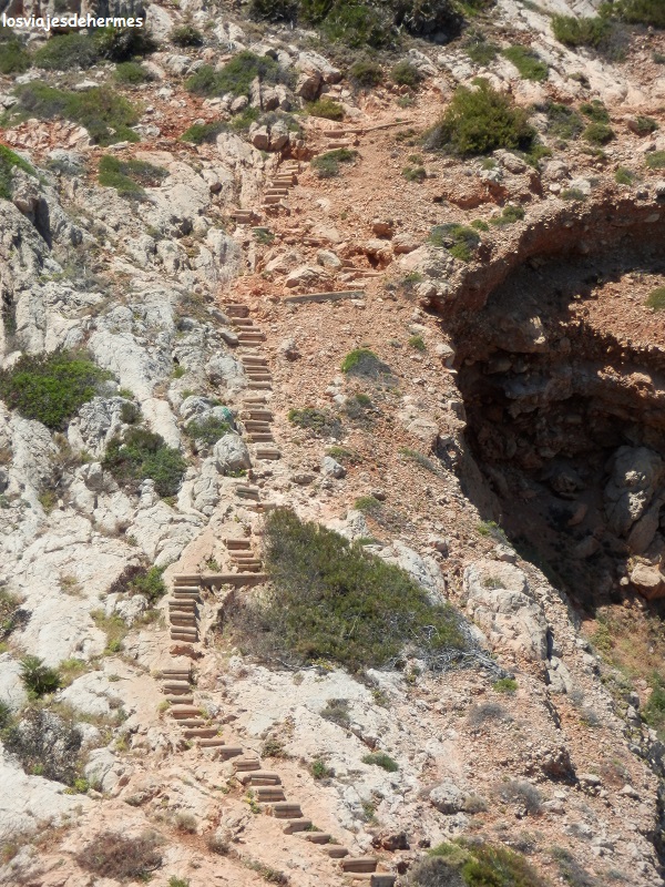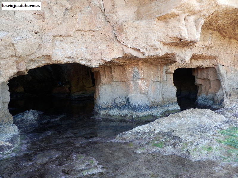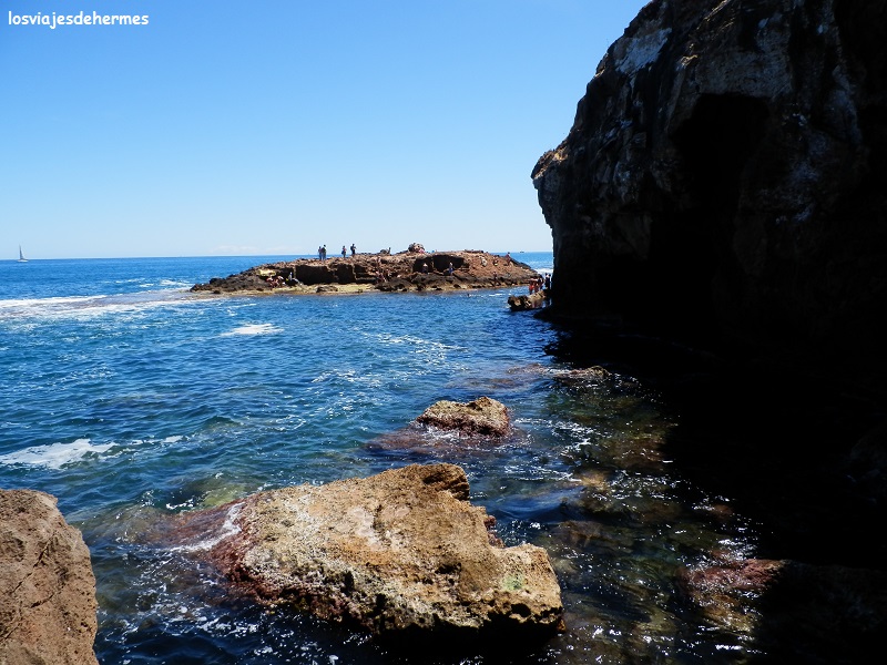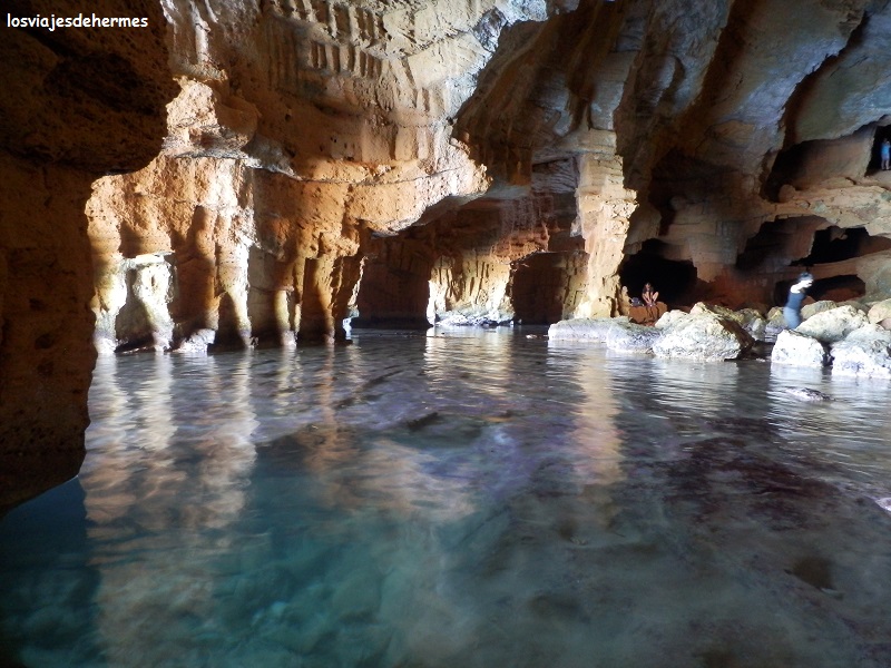 Tuvimos que preguntar para localizar el sendero que lleva hasta la cueva Tallada, subiendo una calle asfaltada y tomando el camino a mano izquierda, al principio es ancho, pero al bajar por unas escaleras se estrecha e incluso hay algunos pasos un poco complicados en los que hay que ayudarse de cordones o cadenas, por lo que no es apto para personas con problemas físicos o movilidad reducida (si bien la buena noticia es que se puede llegar por mar en embarcaciones pequeñas como kayaks). Tardamos algo más de media hora, pero este paraje compensa por completo el esfuerzo, una preciosa gruta donde se puede disfrutar de varios tonos azules del agua según la luz que la enfoque, darse un buen baño o sentarse en alguno de los muchos rincones a recuperar fuerzas.