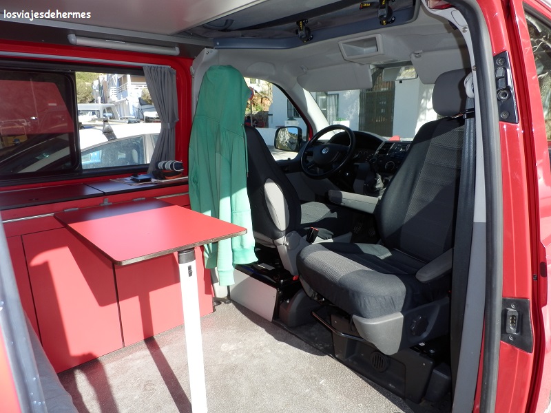 Transporte: furgoneta camper de alquiler de la empresa valenciana Vanyou, a 90 € al día (sumaban 180 € desde la tarde del viernes a la del domingo), con límite de 250 kilómetros diarios (si se alquila más tiempo desaparece esta restricción) pagando a 0,20 € el kilómetro de exceso. Fue el modelo Mohawk, una Volkswagen Transporter roja de 102 CV que tenía techo elevable (por lo tanto, dos camas), muebles, asientos giratorios, calefacción estática (no haría falta), un hornillo para cocinar y un depósito de agua con ducha exterior, en la propia página podréis ver toda la información y fotos de la furgoneta.