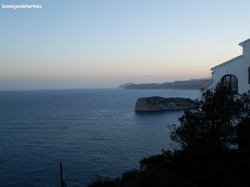 Miriam se animó a bañarse, pero yo encontré el agua un poco fresca. Desayunamos allí y nos fuimos a dar un paseo a Moraira, una pequeña población costera que pertenece al municipio de Teulada y posee unas aguas totalmente transparentes que no tienen nada que envidiar a otras partes del mundo más famosas. Yo ya había estado por la zona y sabía que la carretera de Moraira a Calpe es pintoresca y merece la pena ir despacio, entre curvas, calas y vistas del peñón de Ifach, decidimos no parar hasta la vuelta y llegar lo más próximos posible del parque natural del peñón, es decir a un parking de tierra cercano al centro de visitantes.