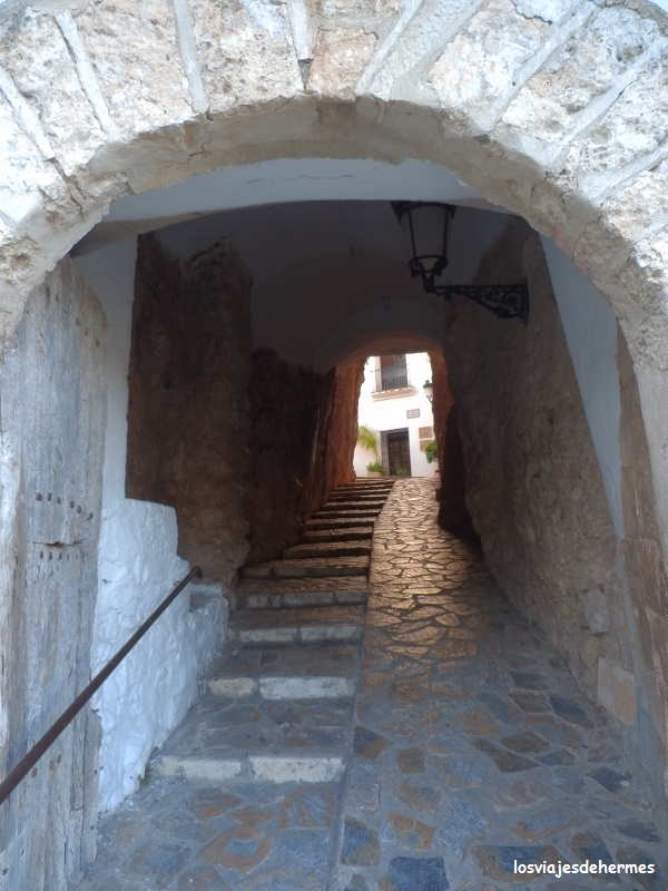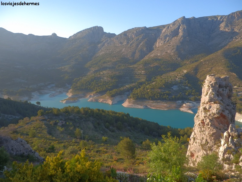 Regresamos hasta Callosa entre interminables campos de nísperos, muchos de ellos plastificados, enlazando de nuevo con la CV-755 que lleva hasta Guadalest tras 15 kms de curvas y vistas cada vez mejores del valle, por lo que hay que tomarlo con calma. Llegamos poco antes del atardecer justo cuando ya no hay que pagar parking, y si en las fuentes había poca gente, el paseo que dimos por este precioso pueblo fue en la casi total ausencia de la misma, lo que, en mi opinión, le dio más valor. Todo estaba cerrado, pero aun así atravesamos el túnel de accesoque lleva a la calle principal (C/ de la Iglesia) y a la plaza de San Gregorio, desde la cual hay un mirador con amplias y excelentes vistas del valle y embalse de Guadalest, el momento fue mágico sin más, el sol caía y dejaba unos tonos anaranjados mientras que el silencio era casi absoluto, yo diría incluso, aunque parezca una contradicción, que se podía escuchar.
