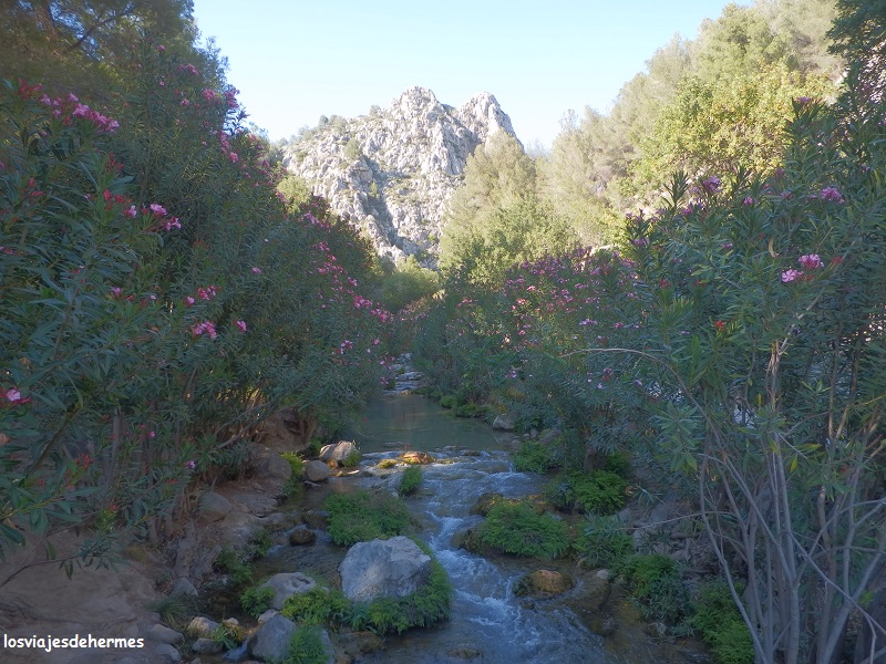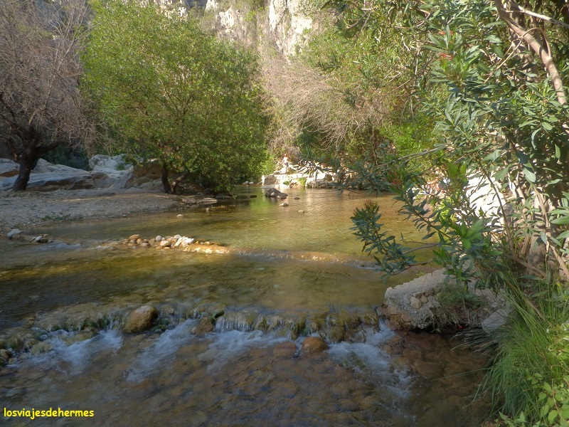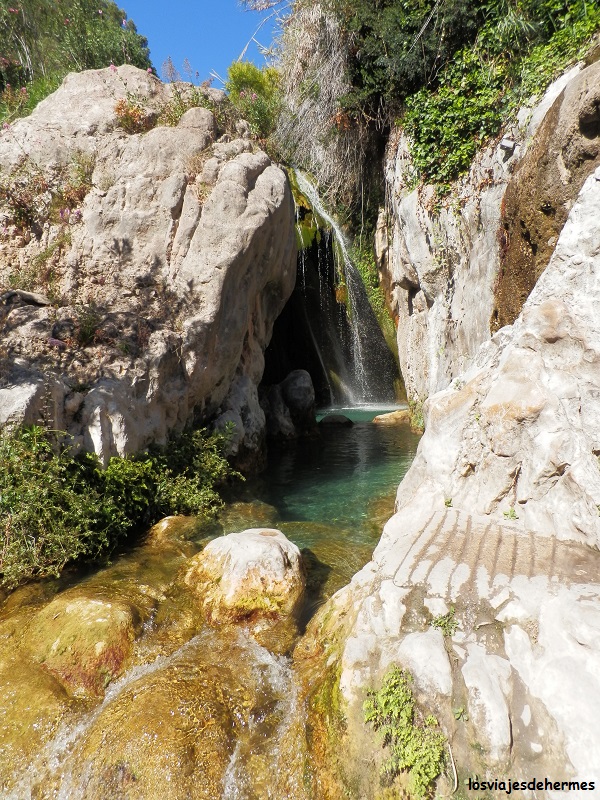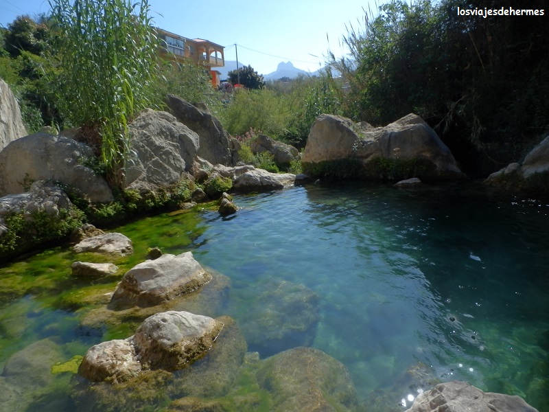 Tras ello pusimos rumbo a las fuentes del Río Algar, el paraje estrella de esta excursión, en el que yo ya estuve con mis padres de pequeño pero que a juzgar por cómo me sorprendió, no recordaba del todo bien. Para llegar seguimos la N-332 casi hasta Altea, pues justo antes está el desvío a la CV-755 a Callosa de Ensarriá y finalmente la CV-715 una vez que se entra en el pueblo, estando ya bien indicadas las fuentes (en total unos 20 kms desde Calpe). Aviso ya que el aparcamiento no abunda y que es una carretera estrecha y que acaba allí mismo, por lo que la mejor opción es dejarlo en el parking de algún restaurante (luego estás “obligado” a comer allí) o, como hicimos nosotros, en un pequeño parking que hay a la entrada que nos costó 3 €.