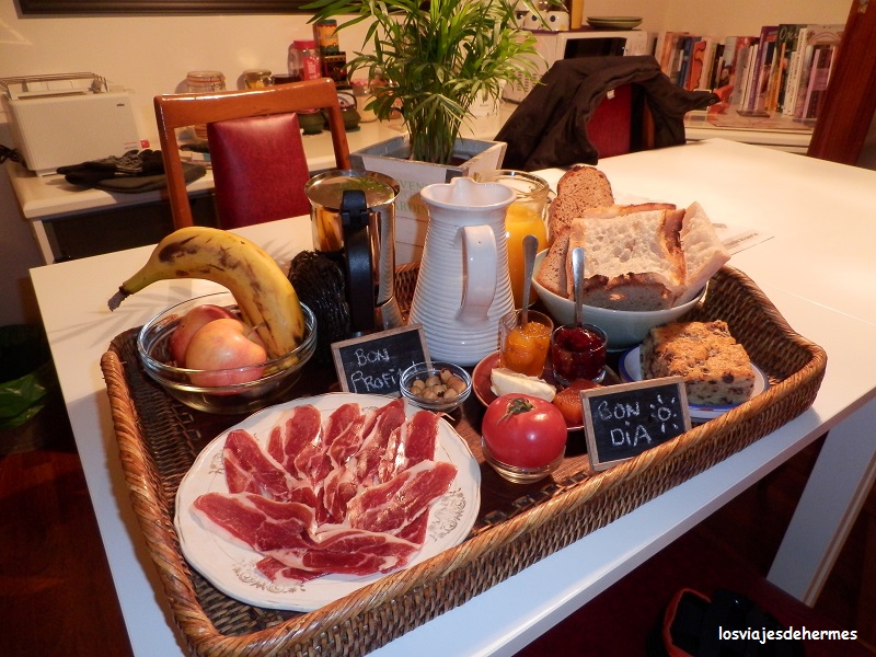Alojamiento: lo reservamos casi la noche antes, siendo en las habitaciones L`Espigoladora (enlace general al no aparecer ya), en la calle Zaporta, número 15. Estaba todo impecable y muy limpio, dándonos a elegir al llegar entre dos habitaciones que compartían un agradable salón y el baño, quedándonos en la que estaba en la parte alta subiendo unas escaleras. El precio por la doble fue de 50 € y contaba con wifi, calefacción, secador en el baño y toallas, además el desayuno estaba incluido (¡y menudo desayuno!), y nos dieron una invitación de un par de cervezas para el bar “La Nevera” al que fuimos a cenar más tarde.